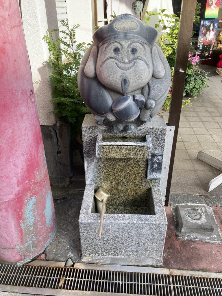 湯の花通りの七福神。この像は大黒様。大黒様のアイテムである大黒頭巾を被り、打出の小槌を振っている。福耳も見事。顔の下へんの顎のあたりに造形されているものは、口かと思っていたが、写真でよく見ると顎髭かなあ。