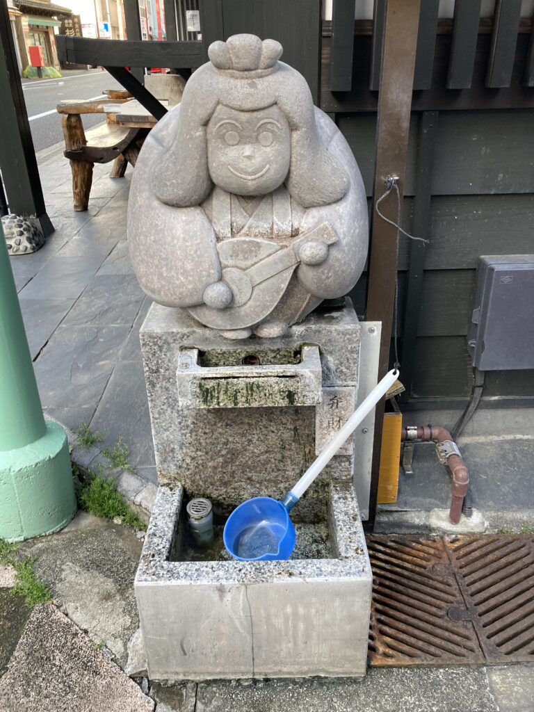 芸術の神・弁財天が湯の花通り商店街でお出迎えしている。この弁天様は、絶世の美女というより湯の町の看板娘といった風情。それがまた街角によく似合っている。お湯をかけるとひときわ艶が匂い立つ。街角のささやかな眼福。
