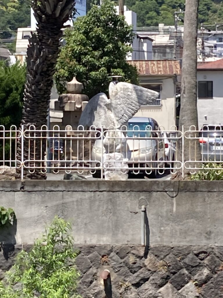 松川遊歩道から松川(伊東大川)を挟んで対岸にある伊東園ホテルの駐車場に、この翼のある彫刻が見える。詳細を見に行く時間が取れなかったが、近くで見ると立派なのではないだろうか。