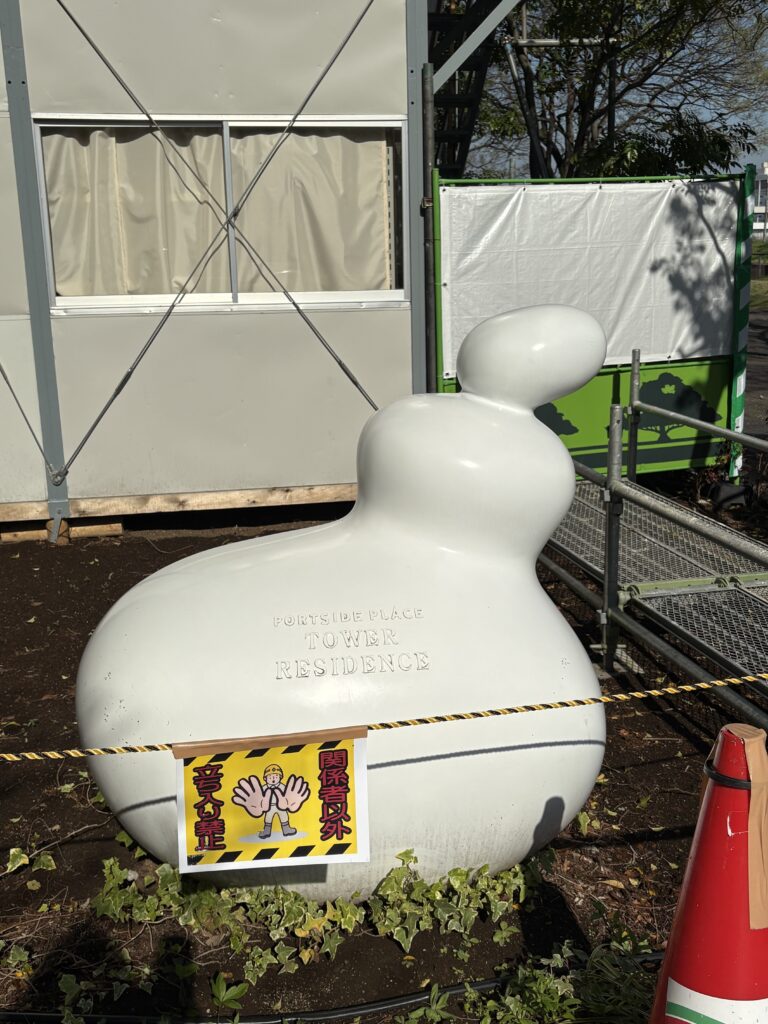 2009年に竣工したポートサイドプレイスタワーの看板と公園側がの入り口の看板となるモニュメント。優しい雲にような安心できる形。