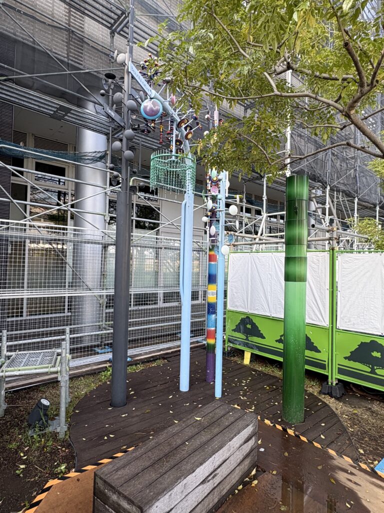 この作品は、横浜ポートサイドのコンセプトである「まちをもっと楽しむためのアート ⁻親しみのあるコミュニティのために」をもとに、アートを鑑賞するだけでなく「使って、感じて、参加できる」ものとして楽しむ作品として製作された。吊られているボールを触ったりして遊べるものだと思うが、この日はちょうど工事中で規制線が張られており、近づいたり触ったりすることができなかった。また条件の良い日に来てみたい。