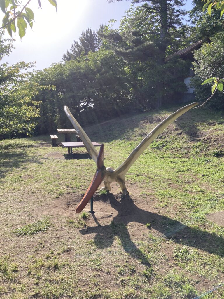 プテラノドンは、両翼を広げると7mに達する巨大な翼竜。白亜紀後期(約8,930万〜7,400万年前)に北米に生息していた。実はプテラノドンなどの翼竜目は、恐竜ではない。恐竜は鳥盤目と竜盤目の2種類で、翼竜目は恐竜への進化の前に分化した爬虫類で、いわば古代の「飛ぶ爬虫類」といえる。プテラノドンは1870年とその発見も早かったので、翼竜のなかでもとても著名な種となっているが、翼竜最大の種のひとつは白亜紀末期に生息したケツァルコアトルスで、翼を広げた幅は10mとなり、現在知られている地球上の全ての飛翔生物のなかで最大級とされる。プテラノドンとケツァルコアトルスはトサカの形が違う。この像は、トサカが後ろに突き出しており、プテラノドンの特徴をよく捉えている。