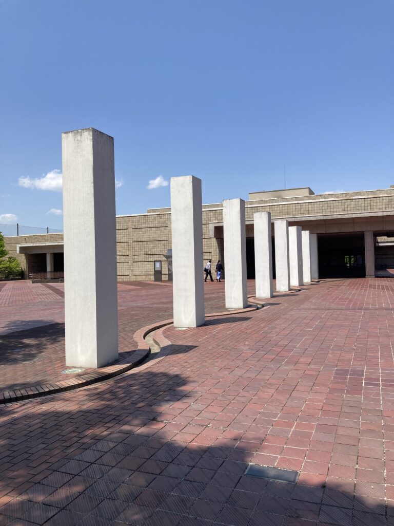 イスラエルの彫刻家であるダニ・カラヴァンによる8本の柱。単なる柱というだけでないいくつかの特徴がある。まず、地面に沿って流れる水路と一体化した造形。歴史のダイナミズムを追想させる。写真だと小さいが、前から6番目の柱は少し柱の向きが違っている。前後の柱と平行になっていない。また、この柱だけ柱の中程に丸い造形が作られている。そして、柱それぞれの高さも、傾斜に沿って僅かずつ高さが調整されている。柱の影の角度も計算して作られているらしい。1番奥の柱は建物を支える柱として美術館と一体化している。