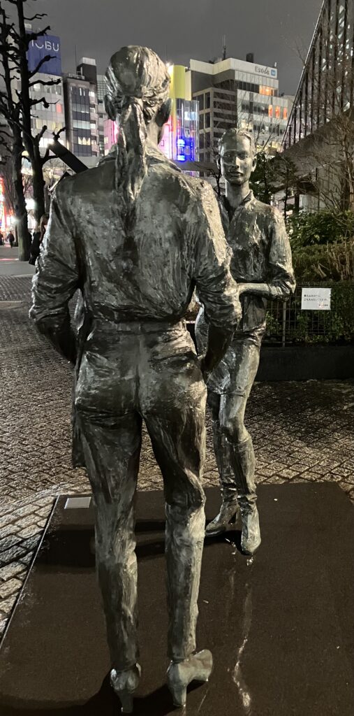 向かい立つ女性像。朝倉響子の持ち味が光る作品。人物2人を像にする時、普通は寄り添わせたり、何らかの絡み、あるいは連動性を持たせることが多いと思う。この作品のように2人の間にある距離を持たせ、鑑賞者に関心を向けることなく互いに相手を見合うような作品は、朝倉響子以外には知らない。この作品が描こうとしているのは明らかに「関係性」だと思う。右の女性はポケットに手を突っ込み、左の女性は所在なさげな手と足の動き。手を伸ばしてもギリギリ届かない距離。目も合っていない。手探りで、お互いの関係性を測っているようにも見える。