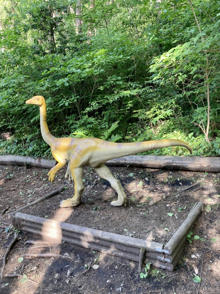 映画「ジュラシックパーク」で一躍有名になった肉食恐竜。ティラノサウルスは確かに怖いが、デカすぎるだけに逃れようがある。しかし、このヴェロキラプトルは体長2m、体重は15kg程度の俊敏な恐竜。時速60kgで走り、視力も良かった。優れた知能と抜群な運動能力を持ち、群れで狩をする。このモニュメントでは目立たないが、後脚にナイフのように鋭いカギ爪を持っており、ひと蹴りで相手に致命傷を与えることができる。牙も鋭く、集団に狙われたら逃れることは難しい。