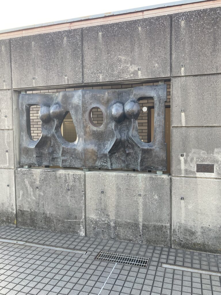 額縁に入ったようなダイナミックな作品。表2体、裏1体で三美神を描いているのだろうか。トイレ棟に設置してあるが、トイレまで厳かに見える。