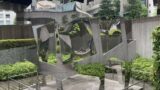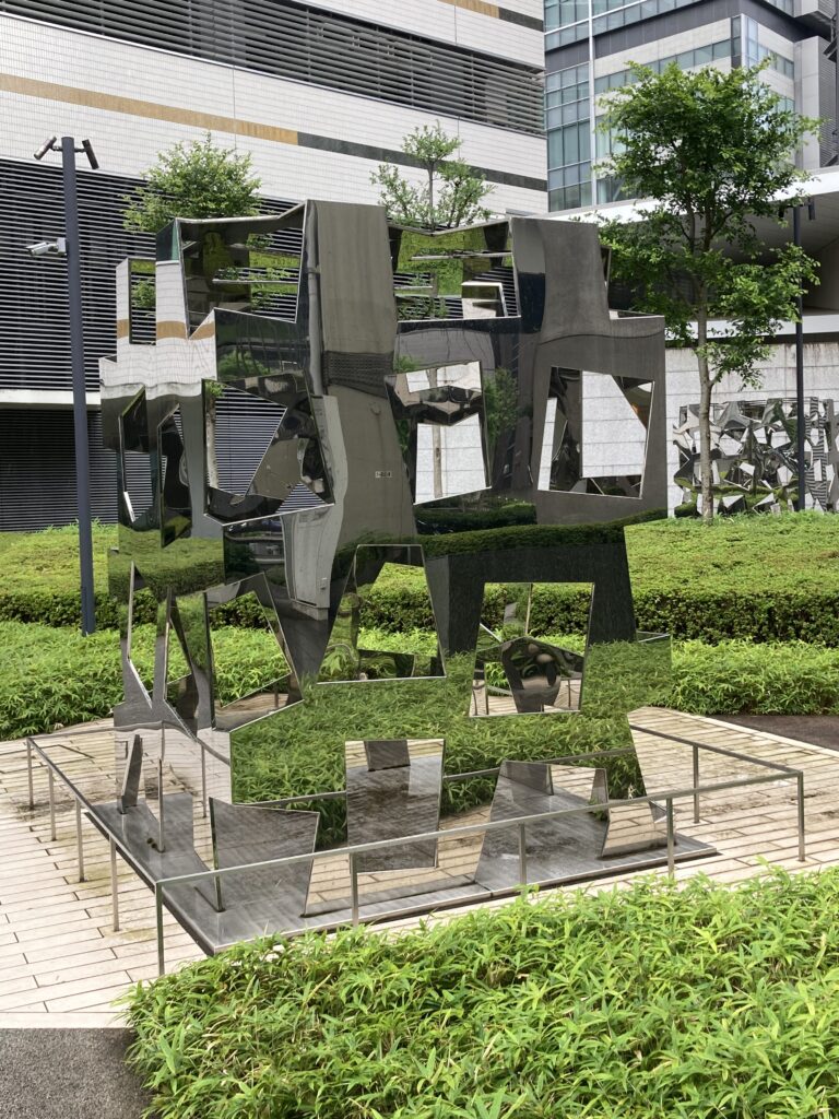 矢萩喜從郎の連作彫刻のNo.3。立方体に目の荒いスリットが入っており、周りの風景の反射もあり、全体の形を掴みにくい。空間の歪みを感じ・吸い込まれそうになる。