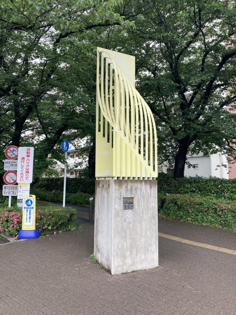 この作品は、川上喜三郎の抽象彫刻。川上喜三郎は1945年満州生まれの建築家・現代彫刻家。見る角度により違った相貌を見せるこの作品は、真理の多面性を表現しているように感じる。タイトルは「出逢」。作品のボトムから上に向かって黄色のラインが融合していく。