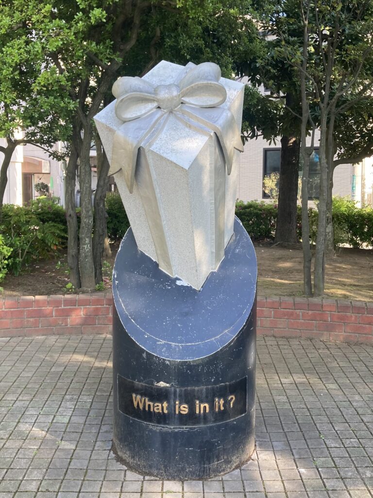 馬頭公園の四隅には、なかがわみさこの作品が設置されている。この作品は「プレゼント」。箱が遠近法的にデフォルメされており、何が飛び出すのか期待を高める。