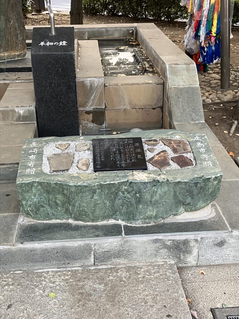 碑に長崎市寄贈と彫られている。長崎の強烈な閃光を浴びた瓦。