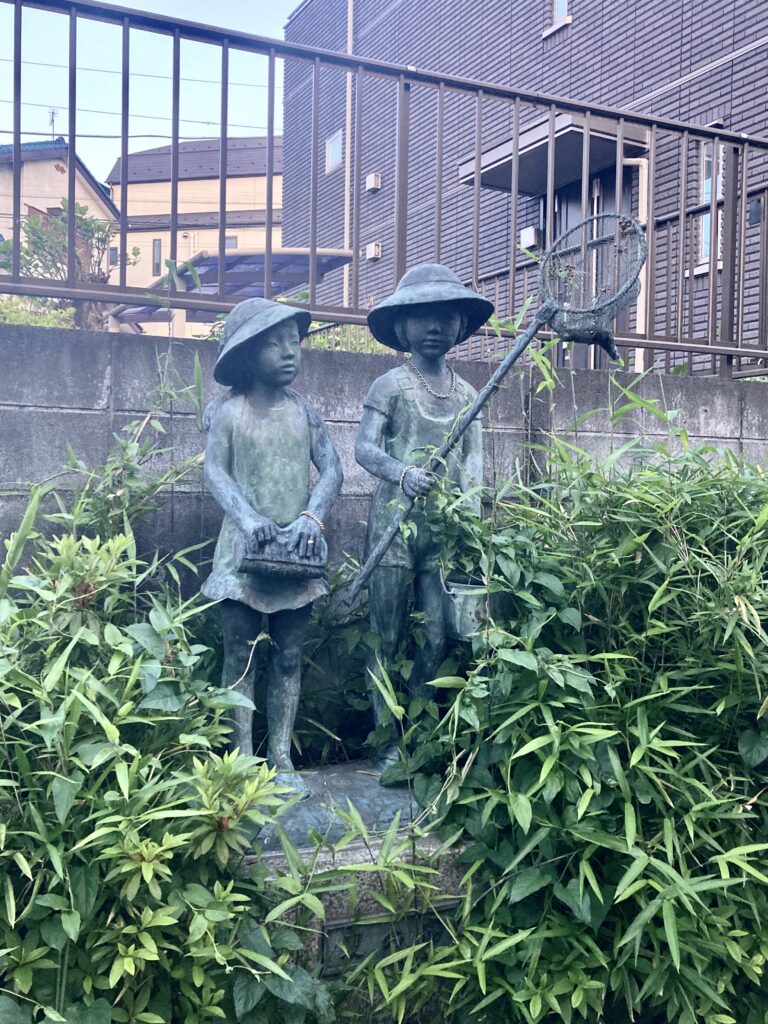 夏の日差しを浴び、虫捕りして遊ぶ素朴な子どもたち。男の子がバケツを持っているところを見ると、ザリガニ捕りかもしれない。兄妹か。昭和の懐かしさを思わせる。この辺りにも、こんな子どもがいたのだろう。