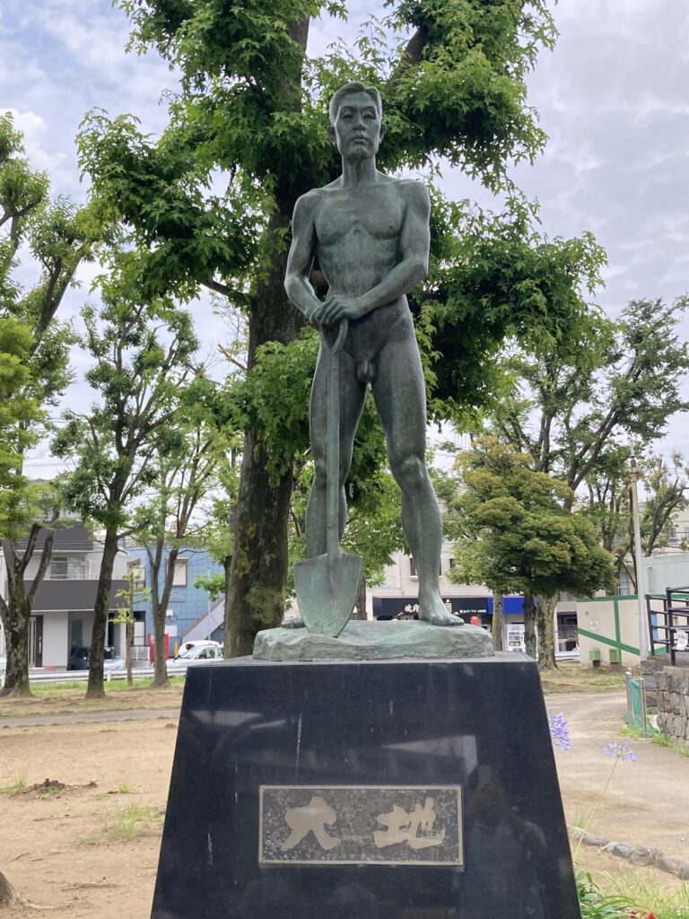 屈強な肉体に、シンプルで無骨なスコップ。このスコップが作品のチャームポイントと言える。人間と道具、主体と客体、意思と作用。そして大地はどう応えるのか。