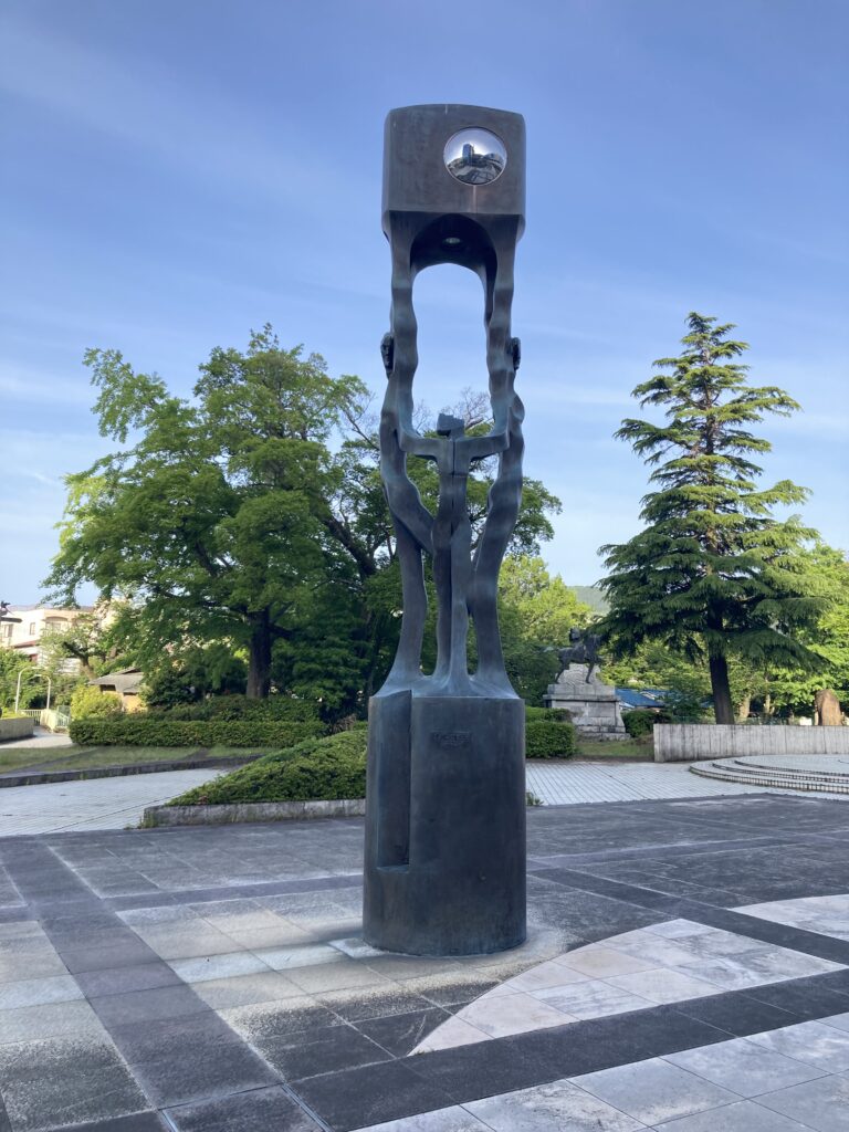 伊東市役所に設置された、堂々とした重岡建治の彫刻作品。大地に根づいて生きる市民の力強さを感じる。人物の頭上に捧げ持っている造形物に、凸面鏡が埋め込まれているのが面白い。