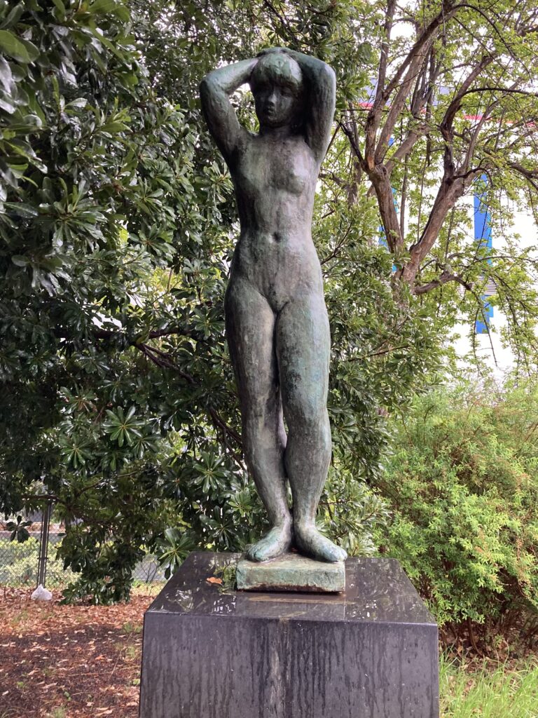 神奈川区の反町公園には、井上信道の彫刻作品が3点設置されている。この作品にはブロンズの土台部分に「N.Inoue」と彫られているがタイトル表示はない。反町公園の他の「陽」「穣」に比べ、これは井上信道らしい柔らかで美しい女性像である。見とれてしまう。