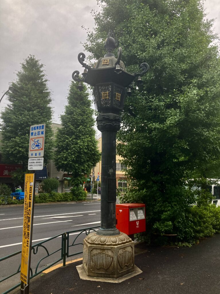 妙法寺は江戸時代から「厄除けのお祖師様」と呼ばれ参拝客で賑わっていた。1889年にJR中野駅が開業すると、それまでの青梅街道鍋屋横丁からの参道が中野駅からに変更され、1903に木製の常夜灯が設けられた。写真の燈篭は1910年に製作された2代目。1994年に解体修理された。