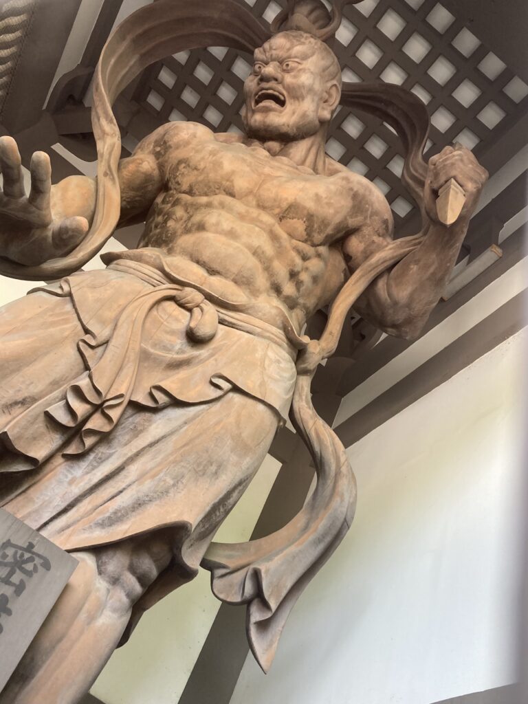 この金剛力士像は、後の大横綱・北の湖が15歳の時の姿をモデルにした迫力満点の木彫。彫ったのは、日展会員・日展審査員の阿部正基。昭和を代表する仏像彫刻の傑作。總持寺三門の落成に合わせて製作された。