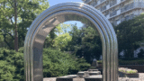 石神井川の「憩いの水辺」をモチーフにした作品。台座に石神井川の地図が彫られている。泳いでいるのはカルガモだろうか。頭の上の自然観察。