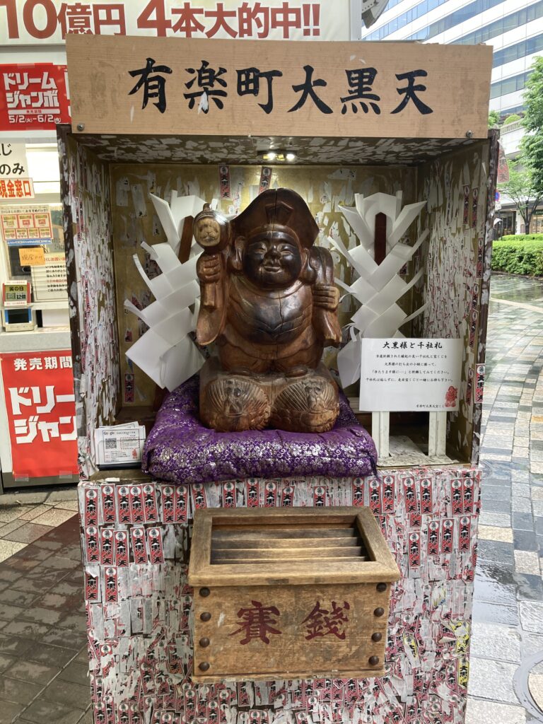 有楽町の宝くじ売り場に鎮座する大黒様。ご利益がありそう。JR有楽町駅には構内にも大黒様がおり、有楽町の地を鎮めている。