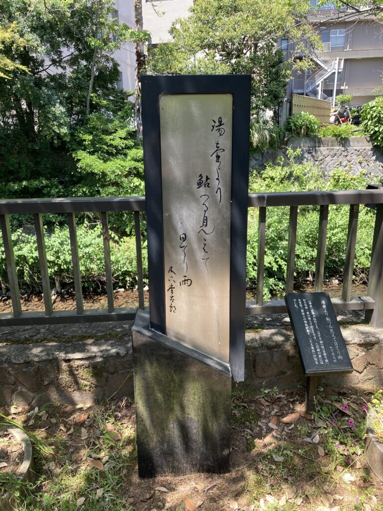 「湯壺」は湯ぶねのこと、「日てり雨」は「日照り雨」、お天気雨・狐の嫁入りのことです。この碑の前には北里柴三郎博士の別荘があり、「千人風呂」が有名でした。