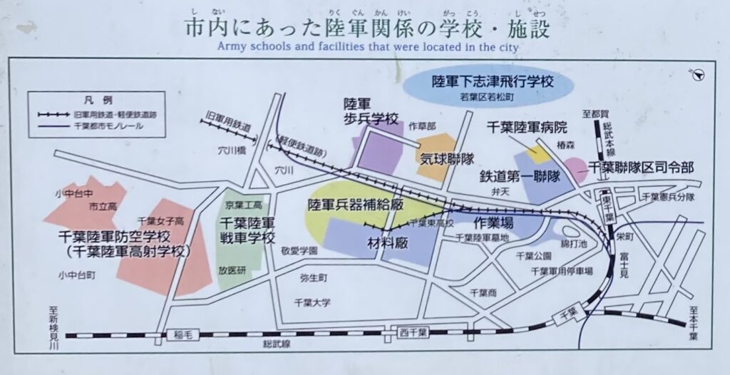 現在の千葉公園付近は陸軍の軍事拠点だった。往時の痕跡が現在も残っている。戦争のリアルが伝わる。説明プレートから採録する。