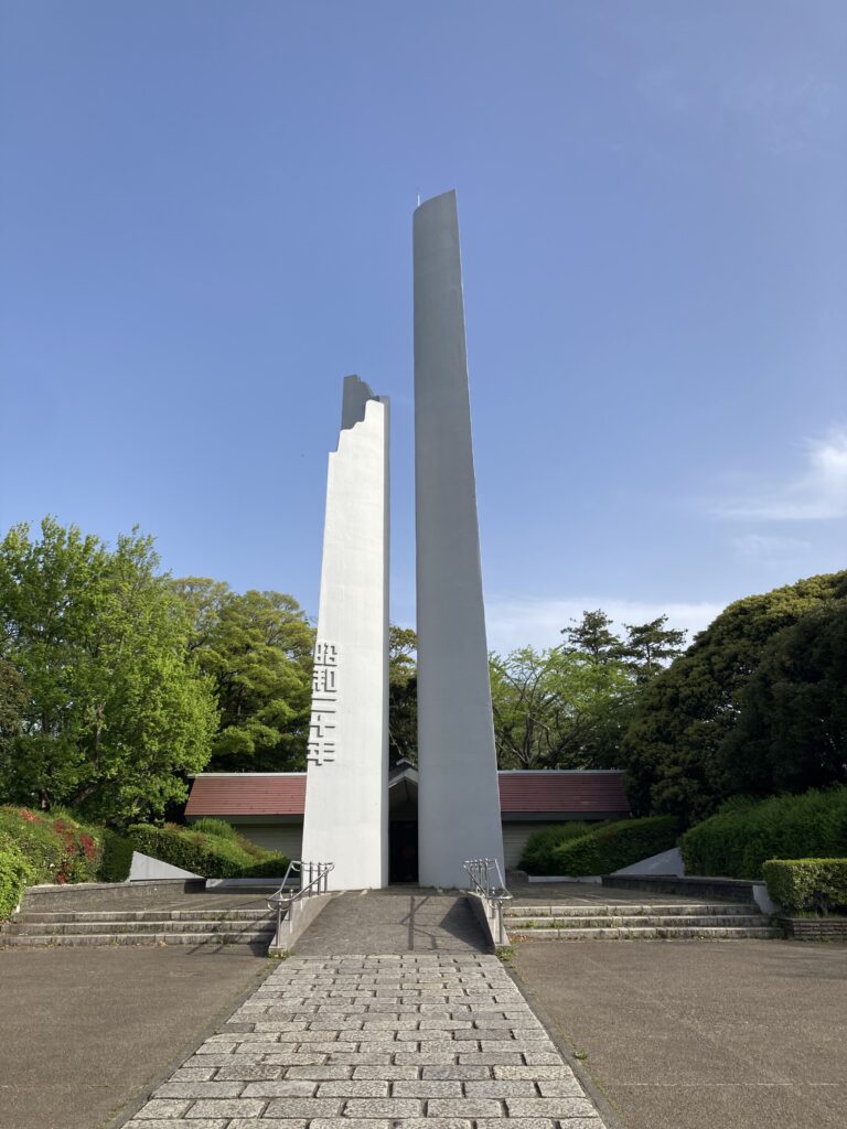塔は門を象徴しており、向って左の塔は、高さ18米で上部を欠いてあり、下部に「昭和二十年」の5文字を浮き出してあります。