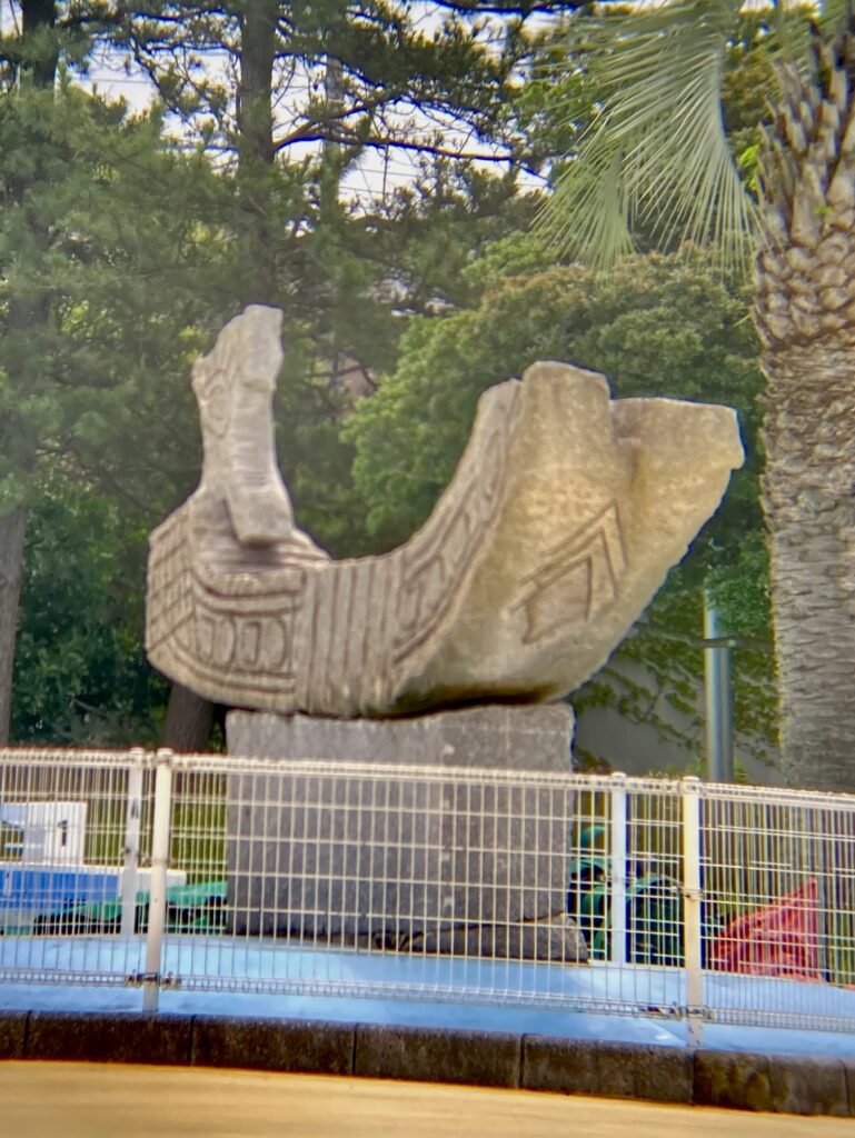 市川市民プールには「水の中の太陽」という作品が2つ設置されているが、これはプールサイドにある方。プールの外から撮影した。古代の箱舟のような様相の石彫作品。当初は金属の作品だったが、作者の意向で石製に再製作されたらしい。プールサイドで起こった様々な出来事や歓声を、石はその記憶に刻み込んでいく。それは、人々の石に対する記憶にもなっていく。