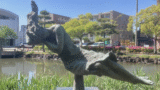 無題ということだが、この像は、水泳女子のプールに飛び込む直前の緊張の瞬間を捉えたもの。競泳のグローピングスタートである。大理石で作られている。現在はここにプールはないが、当時、東京体育館と呼ばれたこの地には50メートルプールがあり、1964年の東京オリンピックでも競技に使われた。デフォルメされた緊張感が伝わる作品。作品の隙間部分も、女子アスリートが象られている。