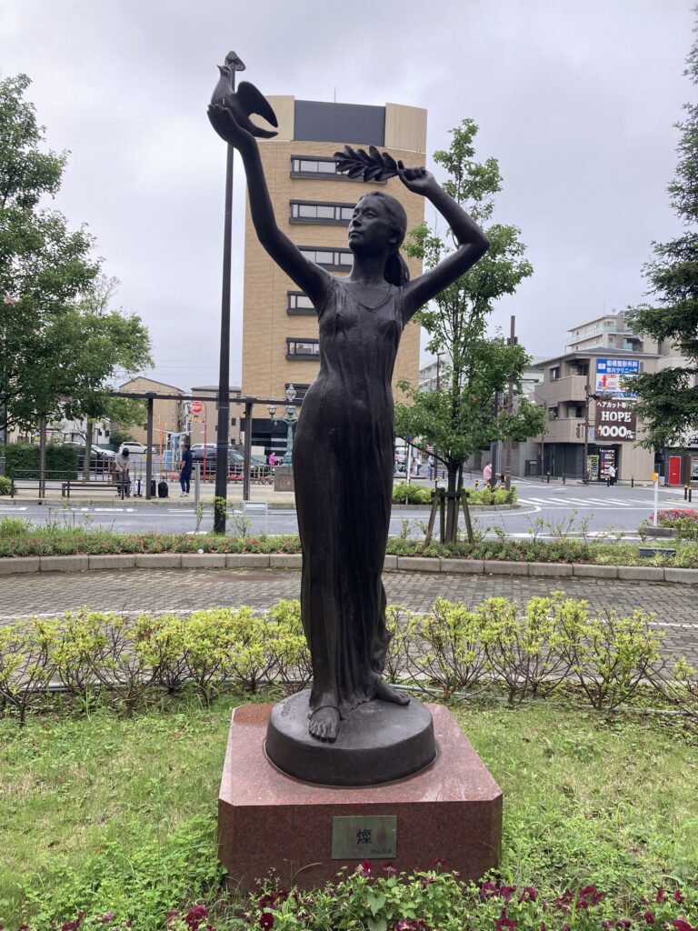 市川駅前で美しく立っているのは増山俊春の「燦」。増山は1946年東京生まれの彫刻家。東京造形大学を卒業。師は彫刻家の舟越保武。この「燦」は、舟越の作風を彷彿とさせる。右手の鳩、左手のオリーブを舞うように携えている。