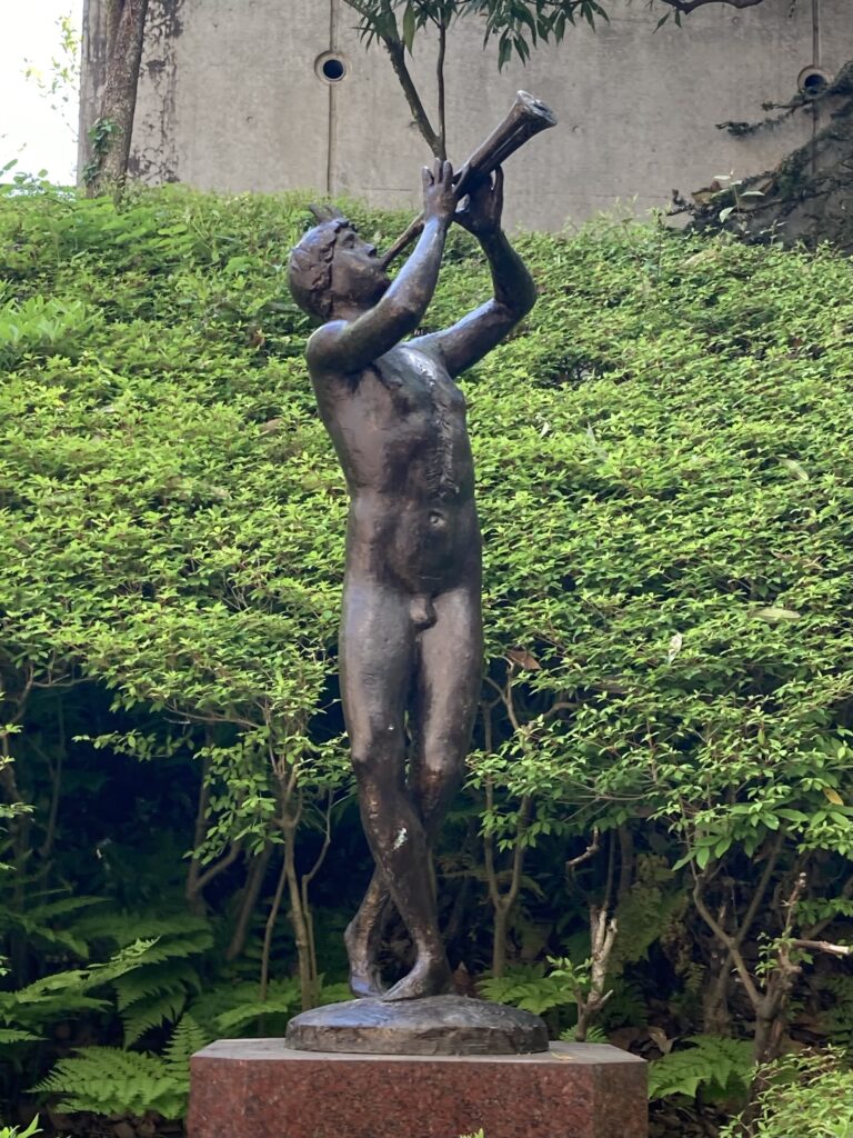 宮城県立美術館には佐藤忠良記念館が併設してあり、佐藤忠良の代表作をたっぷり鑑賞できる。屋外にも、この「牧神」など、佐藤忠良作品が点在している。「牧神」は、角笛を吹く男を印象的に描いている。