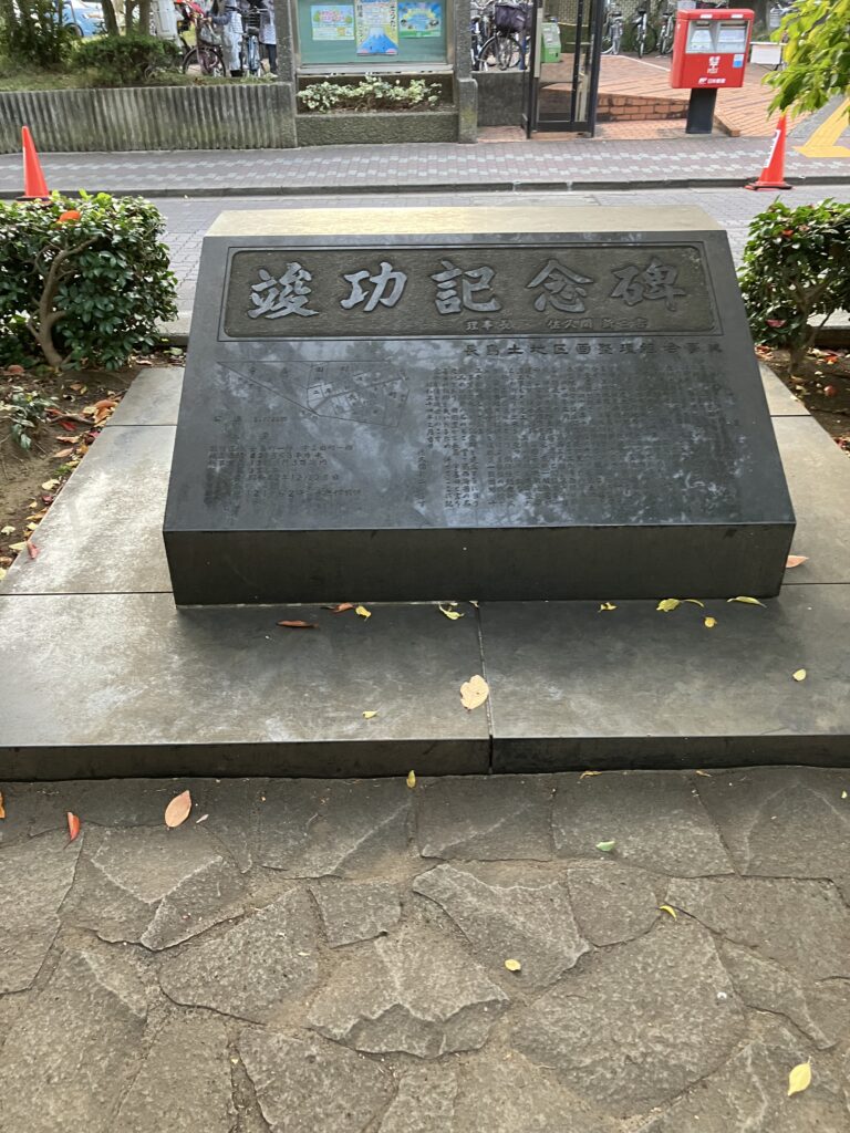 長島土地区画整理組合事業の竣工記念碑。1967年から1979年にかけて行われた。区域は江戸川区長島町、宇喜田町、葛西一丁目の一部(現在の西葛西4丁目、中葛西3、4、5丁目の一部)。碑には、区画地図も記されている。