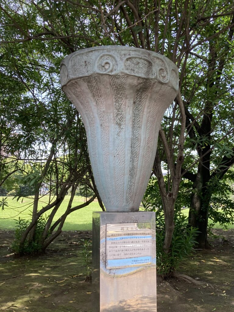 世界一の貝塚を持つ縄文集落 -千葉市加曽利古墳- より出土した煮沸用土器を模し かつて遠浅の海で縄文人が魚介類をあさったこの地に建て 当時の文化をしのぶ