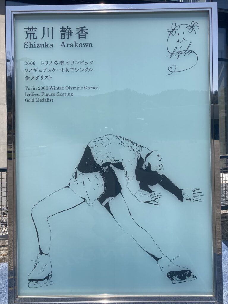 このモニュメントは、2017年に羽生結弦のものと並んで建てられた。ガラスの透明感が荒川静香の滑りを彷彿とさせる。プッチーニ「トゥーランドット」に乗せて観客を圧倒したイナバウアーの流麗さが脳裏に甦る。