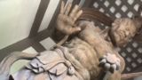 銘板は「財布をくわえた犬(どうしようかな)」としているが、正式には「コーギー犬の資本主義的慣性について」というタイトルのようだ。この記事では銘板に従う。拾った財布を咥えて誇らしく尻尾を振っている。印象的な作品。
