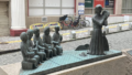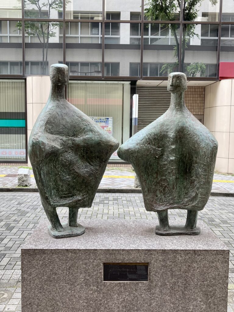 旅先での出会いを描いた作品なのではないだろうか。私には右の人が旅人に見える。人生は旅に例えられる。ひとときの邂逅。そして路は続いていく。井岡俊子の作品は市川公民館にも設置してありタイトルは「旅立ち」。旅をテーマに創作を重ねた作家なのだろうか。