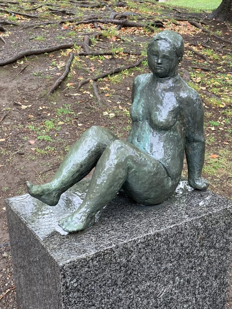 ここ反町公園にある井上信道の「陽」と「穣」は、井上作品の中でも特に印象に残る傑作だと思う。モデルは若くはなく、標準的な美しさを備えているわけではないが、リアリティがあり、そこに生身の人間を感じさせる。この「陽」は、ゆっくり座って片足を少し上げる仕草がとても魅力的だ。あどけなさすら覚える。井上の、モデルに対する深い愛着を感じさせる作品。