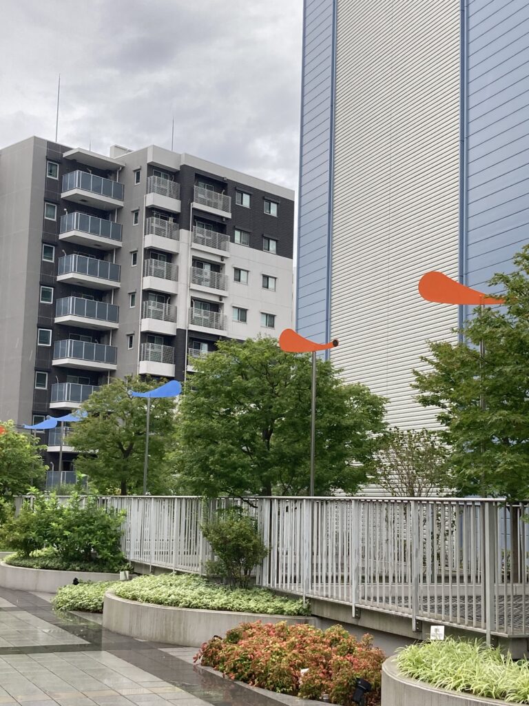 この作品は、風の流れで動くキネティックアート。赤と青のコントラストが街にリズムを作っている。