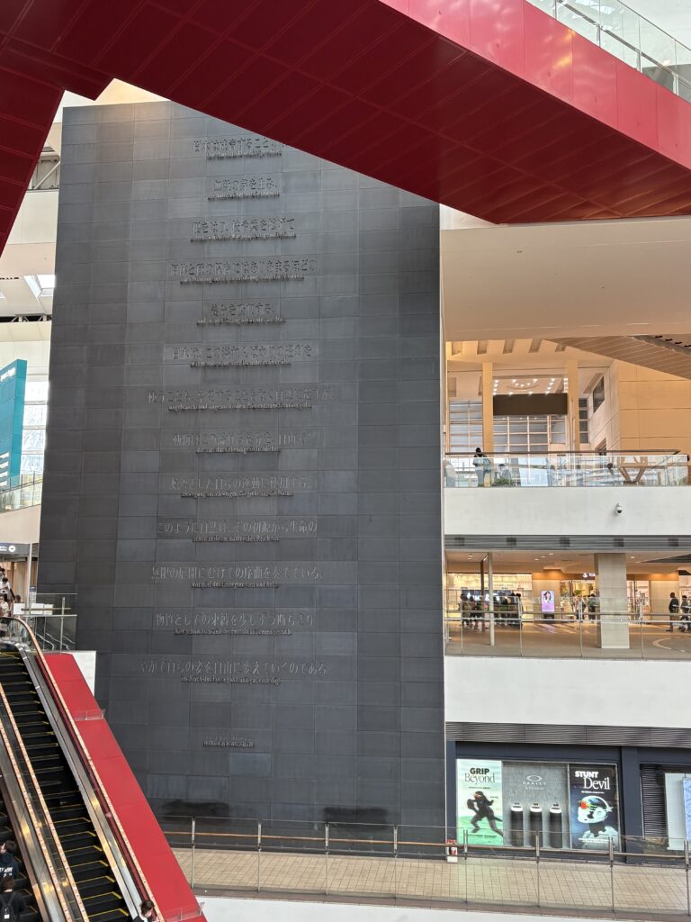 作品のタイトル「The Boundaries of the Limitless」は直訳すると「無限の境界」。余剰の種が豊かさを生み、享受する営みのなかに自由が生まれることで境界のない無限の可能性が広がる。などと一応は書いてみたが、実際に長いエスカレーターに乗っても数文字しか読めず、少し読めても何も解釈できない。ただ、その迫力に圧倒されるだけだった。詩文の解釈も自由だし、モニュメントの圧倒的な存在感を感じられただけでコスースの狙いは果たされているのかもしれない。
