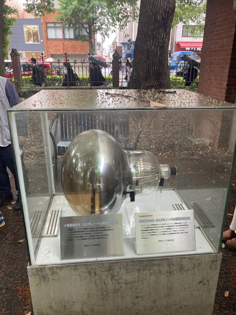 展示されているこの20インチ光電子増倍管を「カミオカンデ」では1,071本、「スーパーカミオカンデ」では11,129本使ってニュートリノを観測した。日本のノーベル賞を支えた技術である。