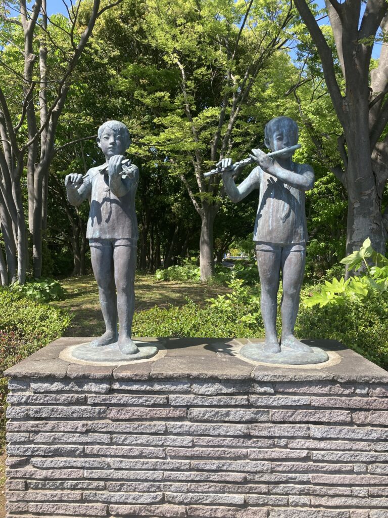 この作品は、楽器を演奏する少年少女。お揃いの服を着ている。森に染み込むような爽やかな奏でを肌で感じる。