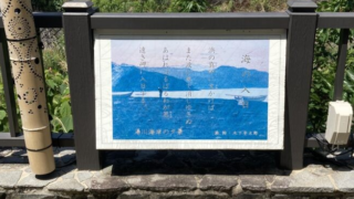 2023.5 撮影タイトル海の入り日作者木下杢太郎設置場所静岡県伊東市 松川遊歩道詩文は下記の通り。海の入日画、詩・木下杢太郎浜の真砂(まさご)に文かけばまた波が来て消しゆきぬあはれはるばるわが思(おもい)遠き岬に入日(いりひ)する(湯川海...