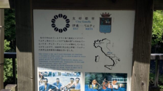 2023.5 撮影タイトル友好都市 伊東 - リエティ作者不明設置場所静岡県伊東市 松川遊歩道製作年1985本文部分を下に転記する。友好都市伊東 - リエティ松川で行われているタライ乗り競走とイタリア・リエティ市で“太陽の祭”に行われている...