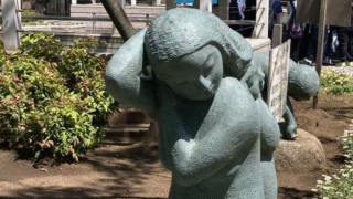 2023.4 撮影タイトル小さな悪魔 作者長谷川昻 設置場所東京都江戸川区 東京メトロ西葛西駅南口 製作年1979お母さんの髪を引っ張って遊ぶ小さな悪魔。微笑ましい。この作品の奥に「水辺」が見える。